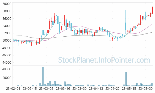 05월 22일부터 06월 05일까지는 53,900원에서 59,500원까지의 가격 범위에서 주가 변화가 있었습니다.