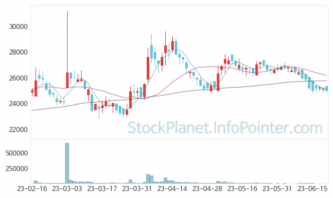 06월 08일부터 06월 21일까지는 24,800원에서 26,850원까지의 가격 범위에서 주가 변화가 있었습니다.