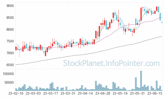 06월 08일부터 06월 21일까지는 8,230원에서 8,990원까지의 가격 범위에서 주가 변화가 있었습니다.