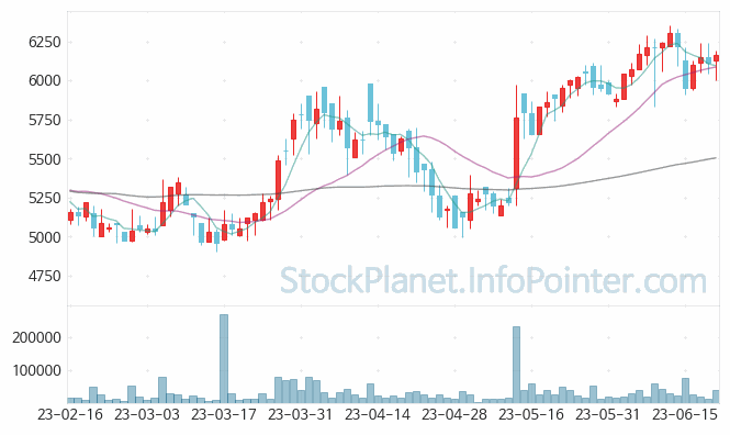 06월 08일부터 06월 21일까지는 5,830원에서 6,350원까지의 가격 범위에서 주가 변화가 있었습니다.