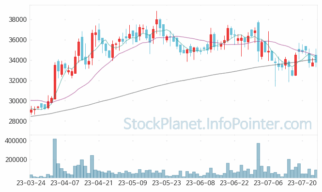 5일의 가격 변화에서 가장 높은 가격은 35,550원이며 가장 낮은 가격은 33,250원입니다.
