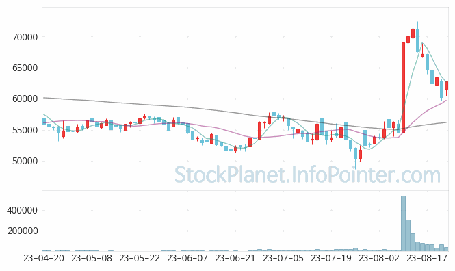 08월 09일부터 08월 23일까지는 54,500원에서 73,700원까지의 가격 범위에서 주가 변화가 있었습니다.