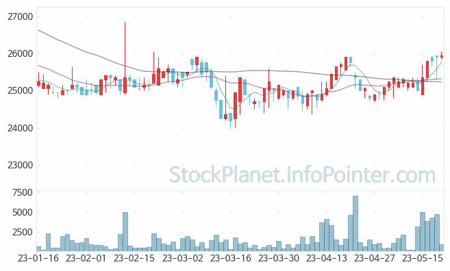 05월 08일부터 05월 19일까지는 24,900원에서 26,050원까지의 가격 범위에서 주가 변화가 있었습니다.