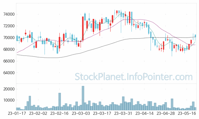 05월 09일부터 05월 22일까지는 67,300원에서 70,700원까지의 가격 범위에서 주가 변화가 있었습니다.